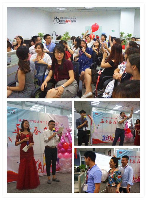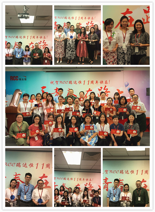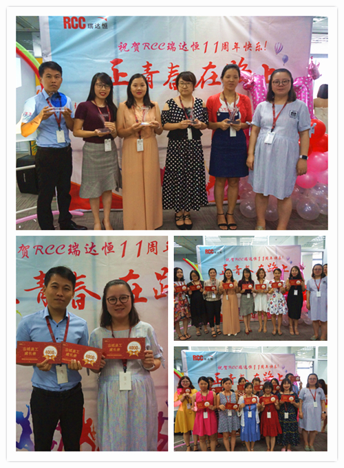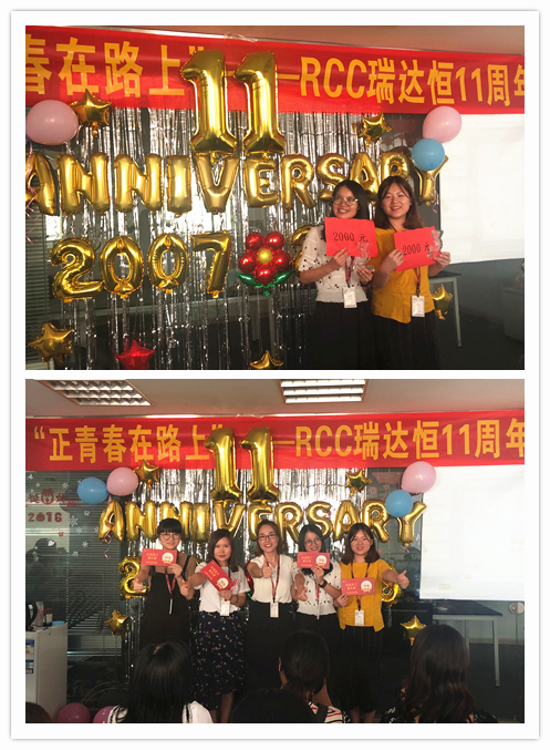 一段由RCC制作的十一周年慶視頻拉開了慶典活動(dòng)的序幕。視頻中,敘寫了這一年來公司取得的驕人成績與開展的活動(dòng)、PK戰(zhàn)中RCC員工們熱血的場面、客戶對RCC信息的評價(jià)片段、CEO在視頻中的致辭等內(nèi)容,震撼著每一名RCC人。RCC在2017——2018年所取得的諸多創(chuàng)新和進(jìn)步、輝煌的成就和永不止步的發(fā)展態(tài)度,讓在場的每一名員工都倍感光榮和自豪。一個(gè)個(gè)輕松活潑的環(huán)節(jié)讓整個(gè)活動(dòng)現(xiàn)場其樂融融,充分展現(xiàn)了RCC大家庭的團(tuán)結(jié)與溫暖,把氣氛推向了高潮。公司領(lǐng)導(dǎo)還為眾多在RCC工作三年或以上的員工頒發(fā)了“忠誠員工特殊獎(jiǎng)”,本次的頒獎(jiǎng)把原先贈(zèng)予金器的形式改為發(fā)放面額1000元到4000元的“成長券”形式,專門用于購買圖書、線上課程、健身卡,幫助老員工提升職場專業(yè)技能和能力、鼓勵(lì)他們積極鍛煉,保持健康的體魄。新的獎(jiǎng)品形式不僅代表著公司感謝忠誠員工與公司共成長的情誼,還表明公司對員工全面發(fā)展的高度重視,公司也將一如既往地為更多有能力、有思想的員工提供更為廣闊的發(fā)展空間。最后,在團(tuán)結(jié)與溫暖氣氛中,在全體RCC員工對公司的祝福里,公司十一周年慶典活動(dòng)落下帷幕。